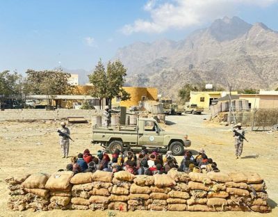 أحبطت الدوريات البرية لحرس الحدود في قطاع الدائر بمنطقة جازان محاولة تهريب طن و300 كيلوجرام من نبات القات المخدر، وقبضت على مهربيها، وهم (60) مخالفاً لنظام أمن الحدود من الجنسية اليمنية، وجرى استكمال الإجراءات النظامية الأولية بحقهم، وتسليمهم والمضبوطات لجهة الاختصاص.