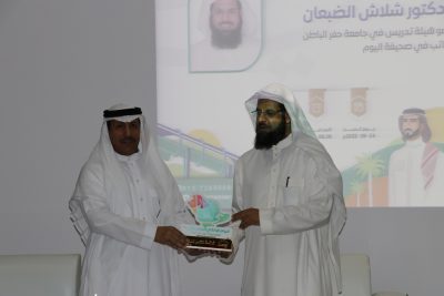 وفي ختام الأمسية كرم مشرف العلاقات العامة والإعلام بغرفة حفرالباطن سلمان الشمري ضيف الامسية الدكتور شلاش الضبعان ومقدمة الامسية الاستاذة نوف التركي.