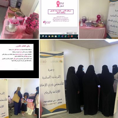 فعلت وحدة الخدمات المساندة للأشخاص ذوي الإعاقة للإناث بالدمام اليوم العالمي لسرطان الثدي تحت شعار ( رايتك وردية ) وذلك يوم الأربعاء ١٤٤٤/٣/٩هـ الموافق الخامس من شهر اكتوبر ٢٠٢٢، بمقر الوحدة تحت اشراف المديرة – الأستاذة نجلاء بنت عبدالفتاح السراج وبتنسيق قسمي العلاقات العامة والبرامج والأنشطة ، وبالتعاون مع التجمع الصحي بالمنطقة الشرقية بمحافظة القطيف ، وبحضور بعض منسوبات فروع الوزارة ، تضمن البرنامج ركن توعوي تثقيفي بمشاركة الأخصائية الاجتماعية ا/ صابحة آل حسن وأخصائية التمريض ناريمان آل خضر ، اجرين فيه توعية مكثفة