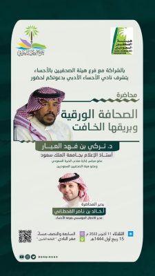 ينظم نادي الأحساء الأدبي بالشراكة مع هيئة الصحفيين السعوديين بالأحساء محاضرة إعلامية يتحدث فيها الدكتور تركي بن فهد العيار ، أستاذ الإعلام بجامعة الملك سعود ، عضو مجلس إدارة منتدى الخبرة السعودي وعضو هيئة الصحفيين السعوديين ، وستقام المحاضرة – بإذن الله – على مسرح النادي مساء الثلاثاء ١٥ من ربيع الأول الجاري ١٤٤٤هـ الموافق ١١ أكتوبر ٢٠٢٢م وتتناول موضوع ” الصحافة الورقية وبريقها الخافت ” وتأتي هذه المحاضرة انطلاقا من التعاون الثقافي والإعلامي القائم بين النادي وهيئة الصحفيين السعوديين فرع الأحساء لتقديم مامن شأنه خدمة المشهد الثقافي والإعلامي في المحافظة.