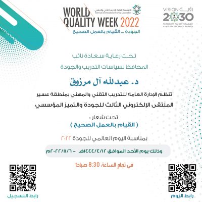 برعاية نائب محافظ المؤسسة العامة للتدريب التقني والمهني لسياسات التدريب والجودة الدكتور عبدالله ال مرزوق تنظم الإدارة العامة للتدريب التقني والمهني بمنطقة عسير يوم الأحد القادم الموافق 12/4/1444هـ الملتقى الإلكتروني الثالث للجودة والتميز المؤسسي تحت شعار (الجودة.. القيام بالعمل الصحيح) وذلك بمناسبة اليوم العالمي للجودة 2022م.